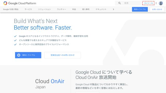 まず、Googleアカウントにログインした上でGoogle Cloud Platformにアクセスします。右上の「コンソール」をクリックします。