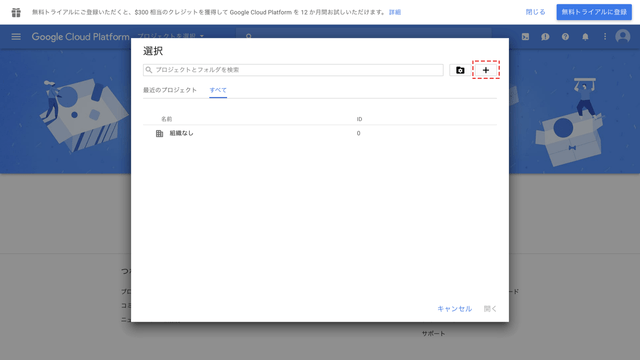 プロジェクト選択画面になるので、新しいプロジェクトを作成します。右上の「+」ボタンをクリックします。