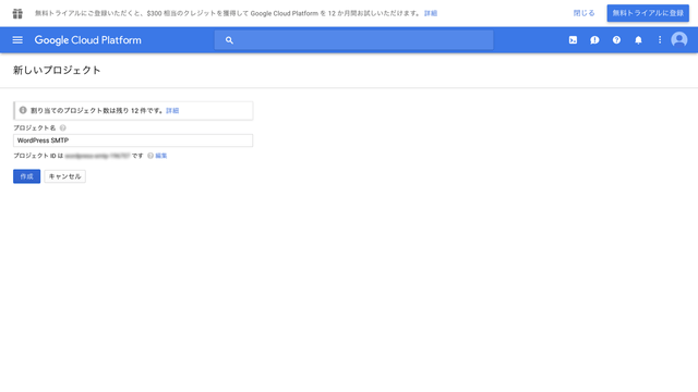 プロジェクト名に分かりやすい名前を入力し、「作成」ボタンを押します。