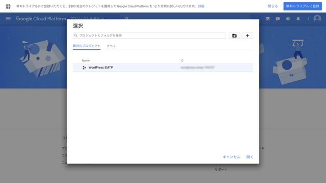 少し作成完了まで時間がかかるかもしれませんが、完了すると先ほどの画面に今作成したプロジェクト(今回はWordPress SMTP)が表示されるので、選択して「開く」をクリックします。