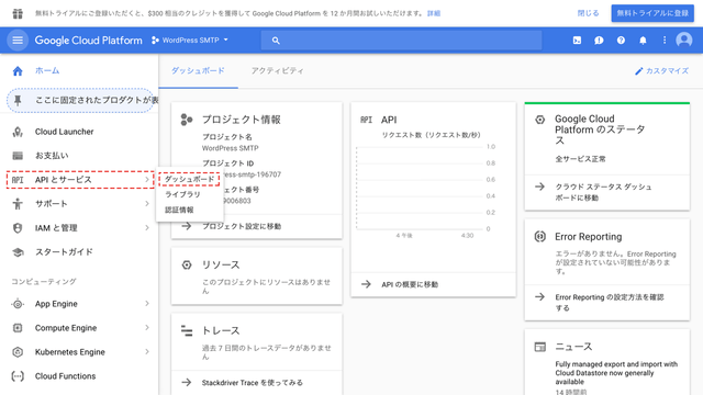 ダッシュボード画面が表示されます。図のように左側にメニューが出ていない場合は左上の三本線のハンバーガーボタンを押して開きます。その中から「APIとサービス」の中の「ダッシュボード」をクリックします。
