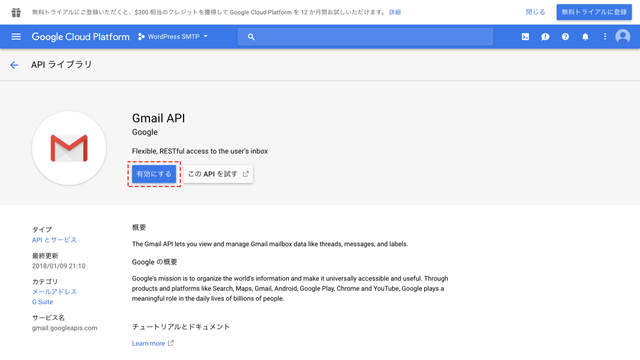出てきたGmail APIをクリックします。
