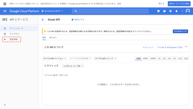 ダッシュボード画面に戻るので左側のメニューから「認証情報」をクリックします。