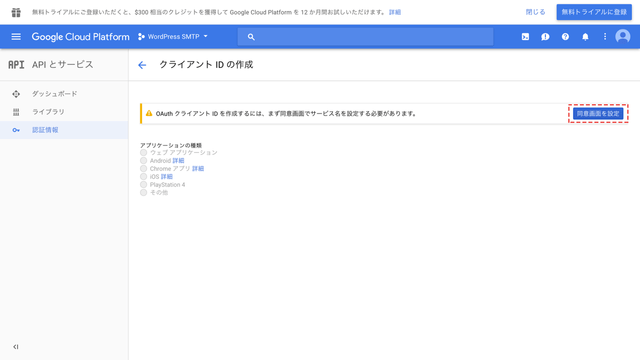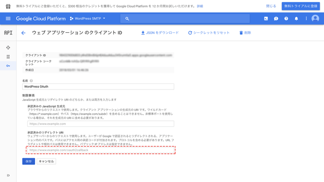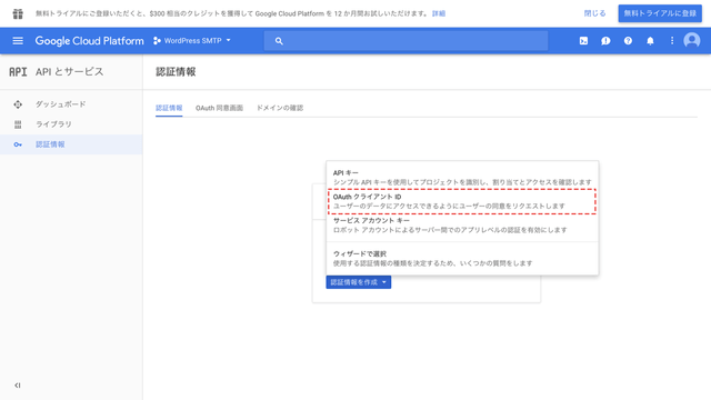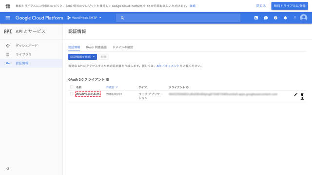 再度Google Cloud Platformに戻り、Client IDの表示を閉じ、左側の認証情報から先ほど作ったサービス(今回はWordPress OAuth)をクリックします。