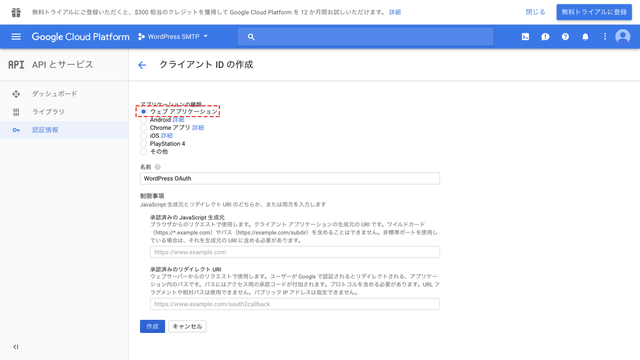 アプリケーションの種類から「ウェブアプリケーション」を選択、名前の欄にこのサービスの名前(今回はWordPress OAuth。この名前はGoogleアカウントの「アカウントにアクセスできるアプリ」などに表示されるので分かりやすい名前の方がいいです。)を登録します。