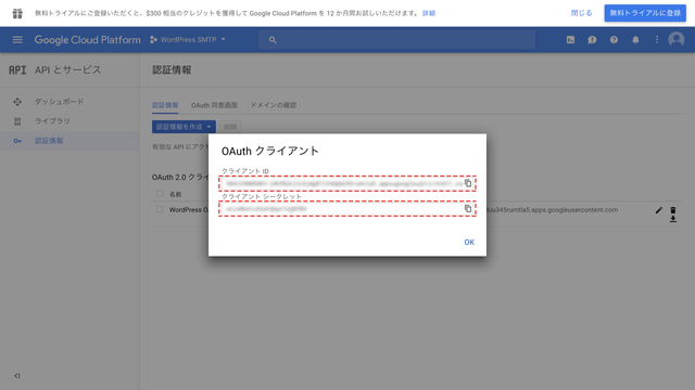 すると、「クライアントID」と「クライアントシークレット」が発行されるので、これをコピーします。この画面は閉じずにWordPressの管理画面を別タブなどで開きます。