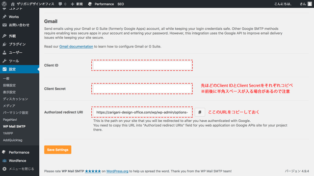Client IDとClient Secretを入力したら、Authorized redirect URIのURLをコピーしておきます。そこまでできたら、「Save Settings」をクリックします。