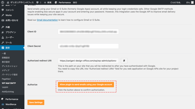 これでGoogle、WordPress側での設定が完了したので、最後に使いたいGmailのアカウントで認証します。
