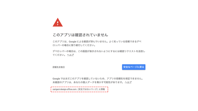 すると、上のような警告画面が出るかもしれません。即席で作ったアプリなので確認は取れていませんが、作ったのが本人なので大丈夫です。今回は「詳細」をクリックして「(安全ではないページ)に移動」をクリックします。