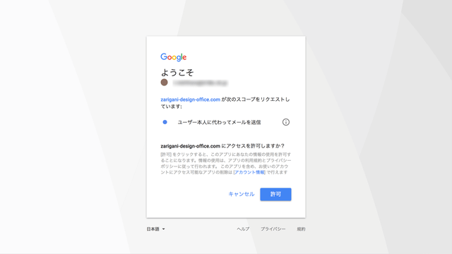 ログインしたアカウントで「ユーザー本人に代わってメールを送信」する権限の許可を求められるので「許可」をクリックします。