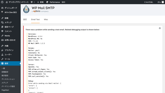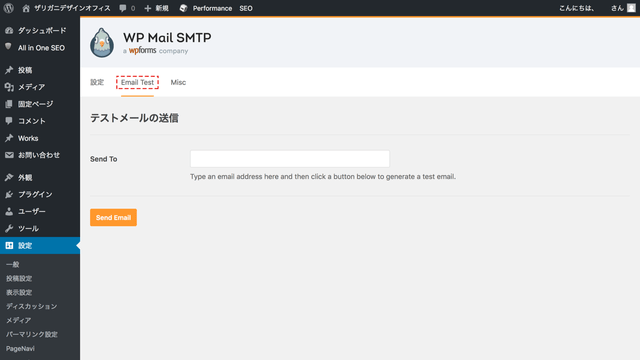 WordPressのダッシュボードの「設定」の中の「WP mail SMTP」をクリックし、このプラグインの設定画面を開きます。